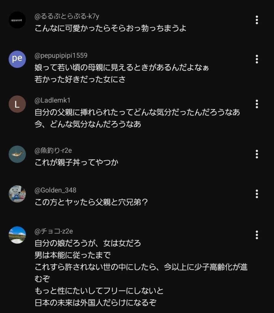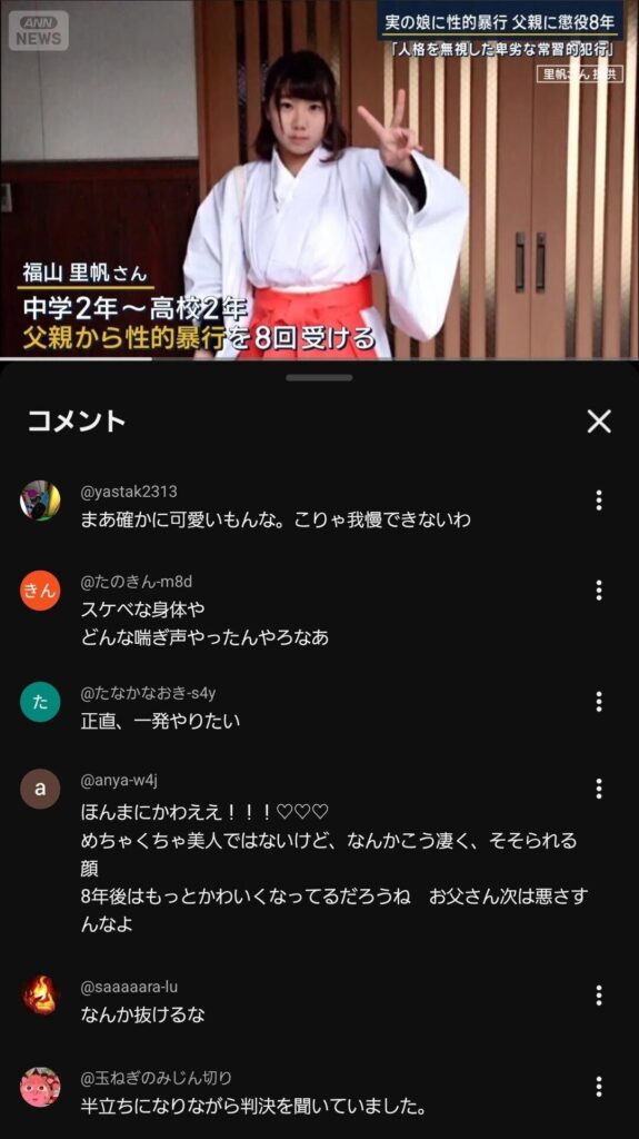 • ANNニュース動画のコメント欄に氾濫する不謹慎コメントを問題視し、コメント例として「美人でスタイル良い」「父親羨ましい」「同意してたんじゃね?」など、被害者を侮辱・性的対象化する内容をスクリーンショットで共有。「この世の終わりみたいな」と表現し、注意喚起。