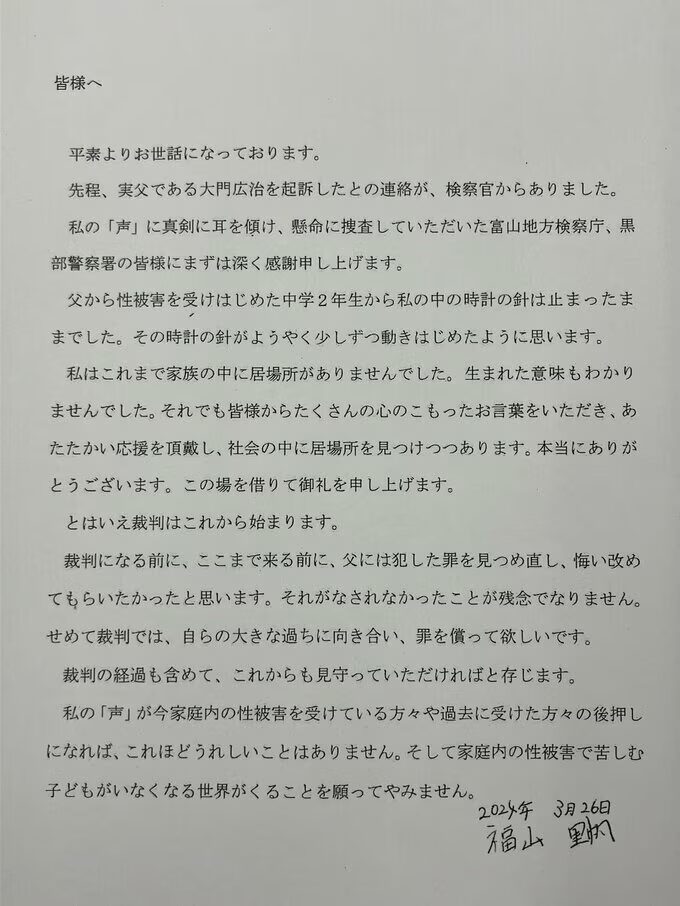 • 福山里帆さん、判決後にテレビ取材(テレ朝「グッド!モーニング」など)で実名・顔出しでコメント。「8年の判決で私の気持ちが認められた」「心の傷は一生消えないが、声を上げて良かった」「親から性的暴行を受けた人々のためになれば」と語る。