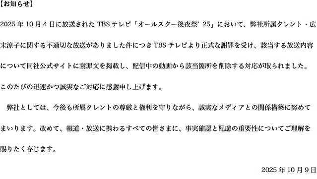 このクイズ演出の発言をめぐり、広末涼子の所属事務所は以下の点を問題視して、TBSに対し正式に抗議を行っています。