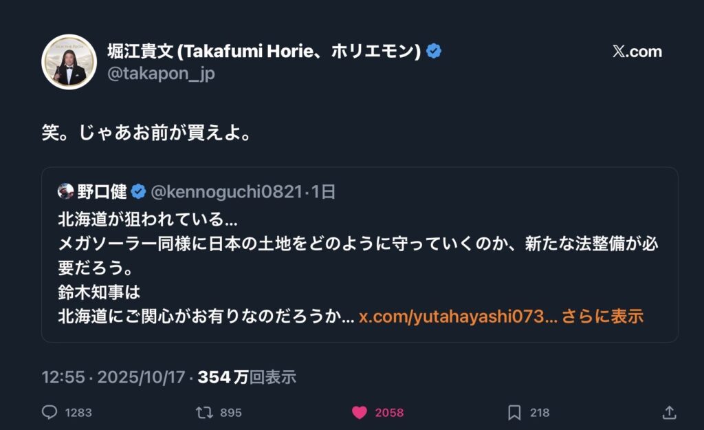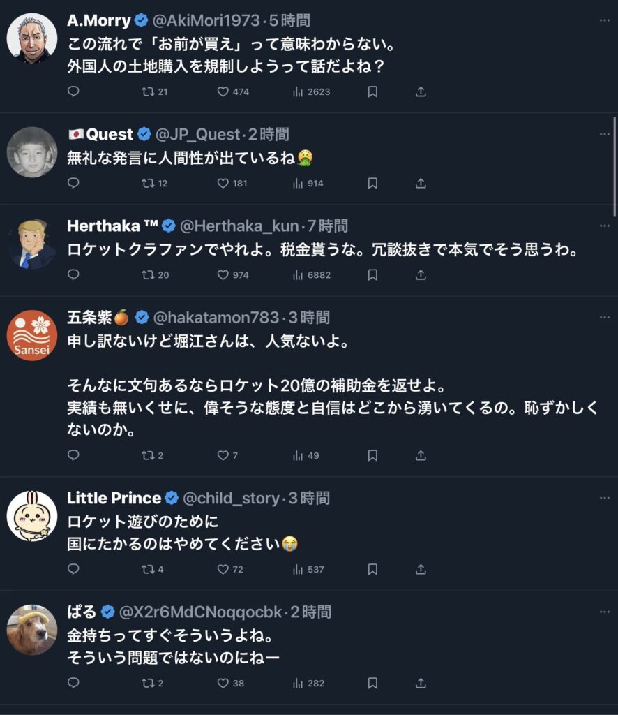 本来は土地規制の是非を巡る真面目な話題でしたが、ホリエモンさんの発言をきっかけに議論の軸がずれ、SNS特有の煽り合い・ブーメラン合戦に発展していった形です。