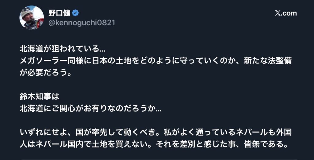 今回のきっかけは、野口健さんが投稿した「日本の土地が外国人に買われすぎている。新たな法整備が必要だ」という内容のポストです。