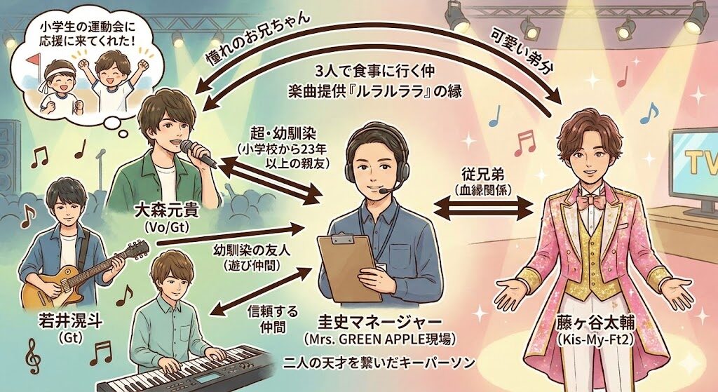 圭史さんは、Mrs. GREEN APPLEのボーカル・大森元貴さんの幼馴染です。