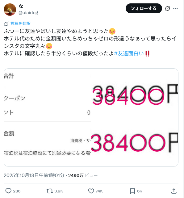 友人とのホテル代のやり取りで“不審な請求金額”に気づき、調べてみるとまさかの展開だったと明かしました。