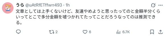 投稿者の最後の一文「友達辞めようと思った☺️」には、多くの共感の声が寄せられています。身近な友人関係でも、お金のトラブルが発生すると一気に信頼が崩れてしまうことを改めて感じさせる出来事です。