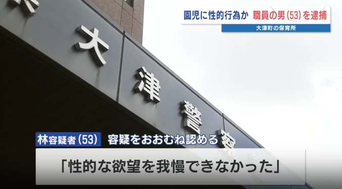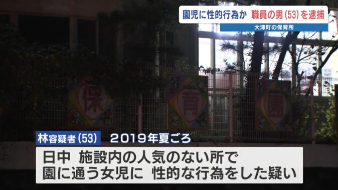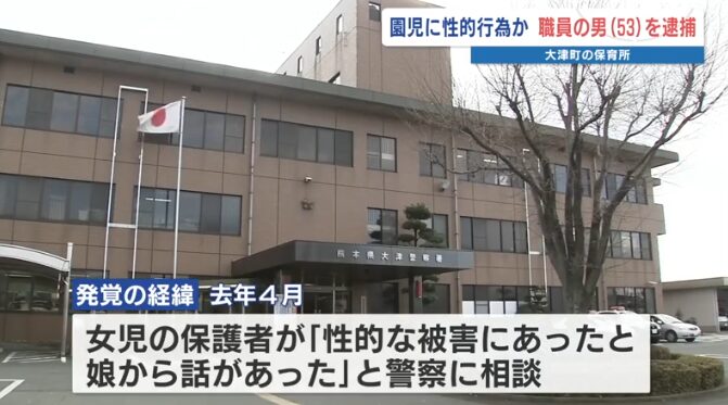 熊本県大津町の保育施設で、2019年に当時園児だった女児に対して性的行為をしたとして、