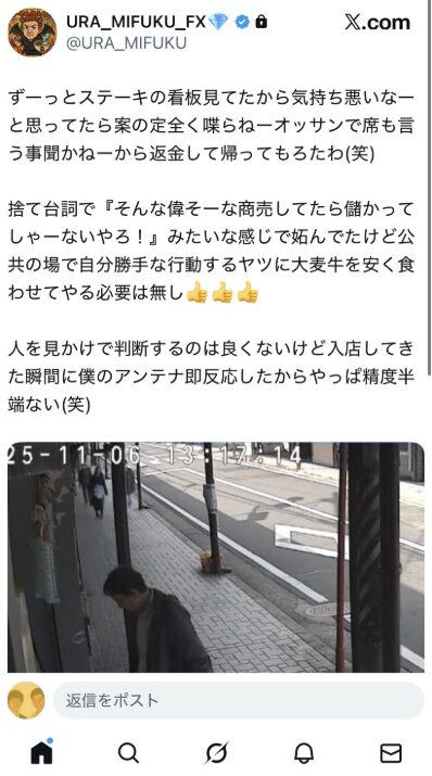「ずーっとステーキの看板見てたら気持ち悪いなーと思ってたら案の定全く喋らねーオッサンで席も言うこと聞かねーから返金して帰ってもろたわ(笑)
