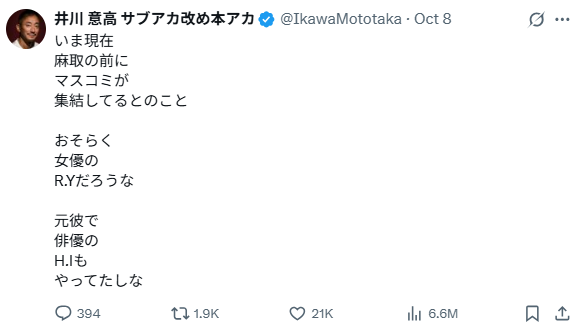 2025年10月8日にX(旧Twitter)で拡散された「女優R.Y逮捕?」という投稿をきっかけに、米倉涼子さんと「元カレH.I」というイニシャルがネット上で話題に。