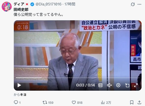- 特定の政策について公明党に配慮したようなコメントが切り取られて広がった